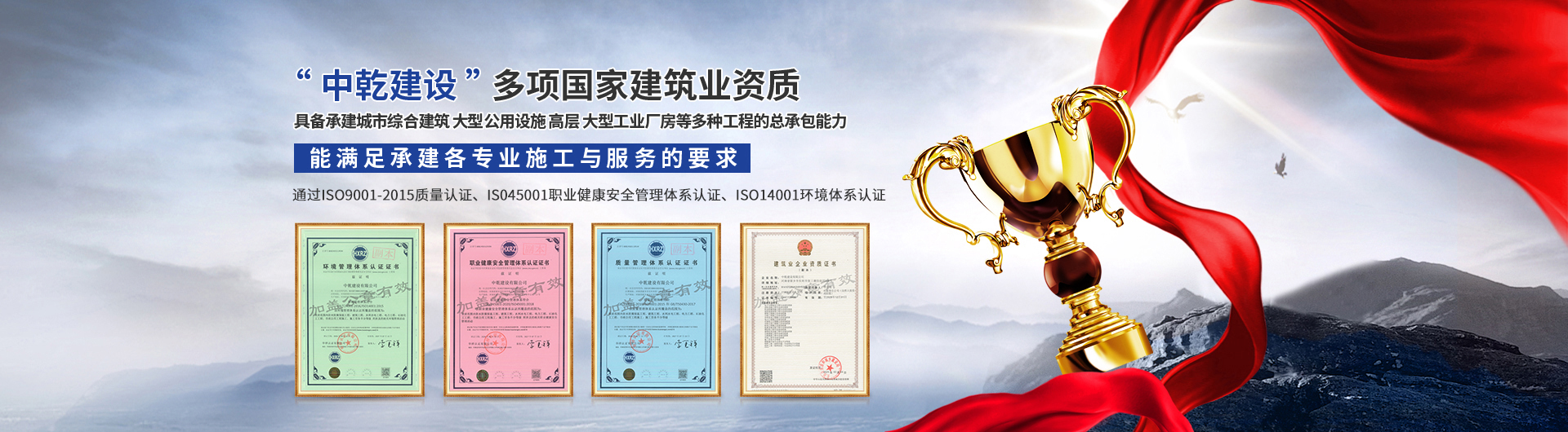 • 中乾建設有限公司成立于2016年,是具有多項國家建筑業資質的企業,注冊資金11800萬元。公司經營范圍以工業與民用建筑為主,集建筑、電力、機電、水利水電、公路、石油化工工程施工總承包;防腐防水保溫、消防設施、建筑裝修裝飾、鋼結構、古建筑、公路路面工程、公路路基工程、環保工程專業承包;模板腳手架、施工勞務等業務于一體,具備承建城市綜合建筑、大型公用設施、高層、大型工業廠房等多種工程的總承包能力。